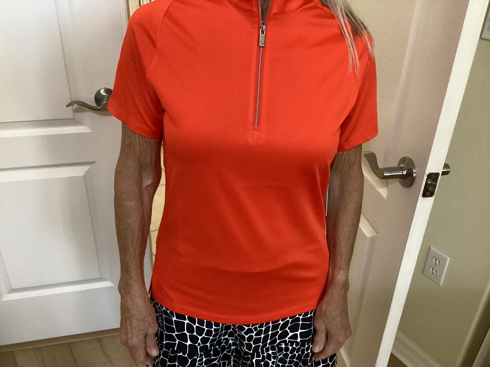 From our Divine Galleria collection. The quarter-zip short sleeve Enriquetta golf top features 8" sleeves, a Mini Mock collar, and vents to stay cool on the course. Moisture-wicking Performance Jersey keeps you dry and comfortable as you play.